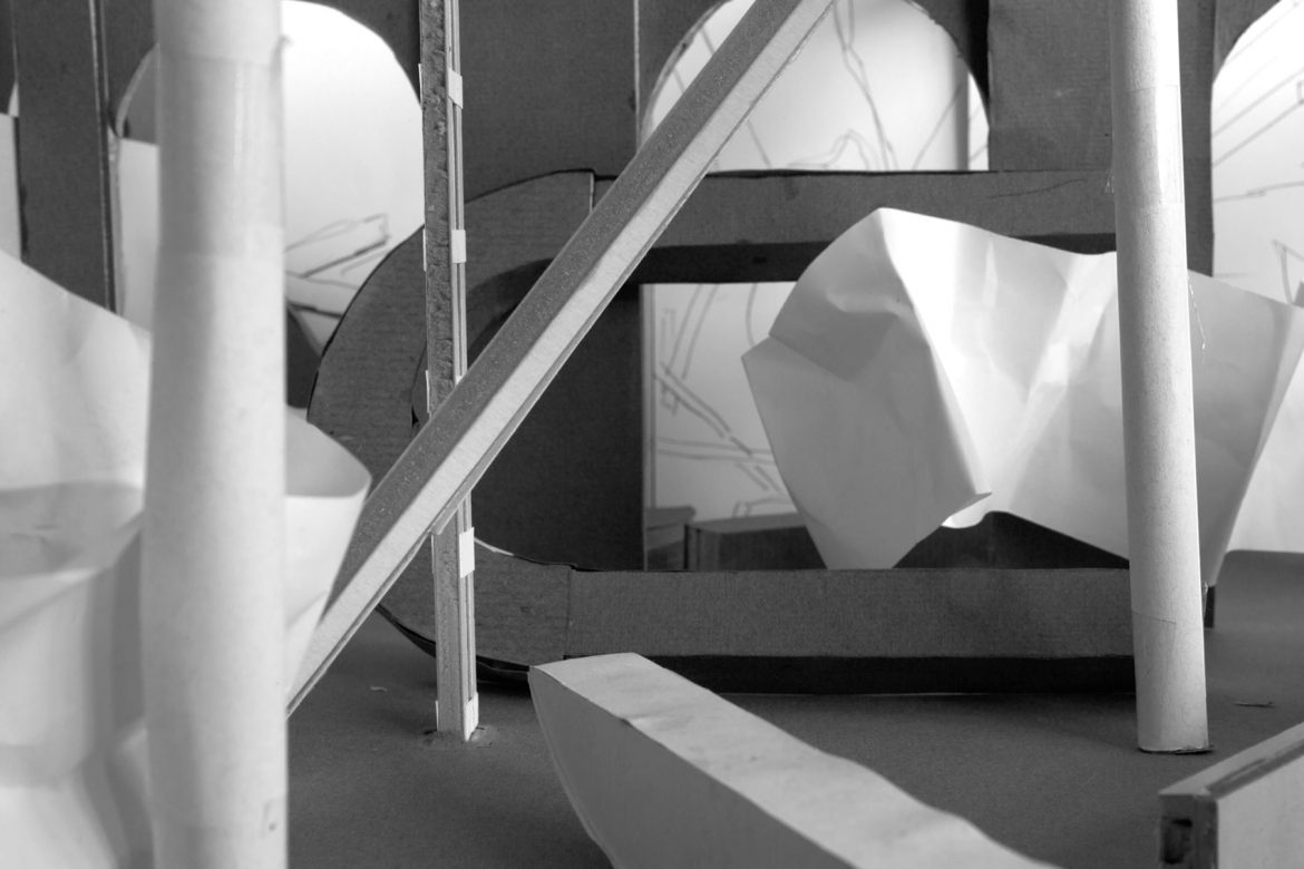 Die Welt ist aus den Fugen gerissen. Alles befindet sich in der Schwebe – ein tiefgreifender, sich stetig ausweitender Prozess. Katrin Glanz interveniert in den heiligen Raum der Galerie. Sie nutzt die charakteristische Architektur der Alten Feuerwache mit ihren Gewölben, Bögen, Balken und Säulen, um eine Atmosphäre der Unruhe und Instabilität zu erzeugen. Dazu dupliziert, rekonstruiert und versetzt sie verschiedene Elemente im Raum neu: herabstürzende Balken, querstehende, zerbrochene Säulen und kippende Gewölbe irritieren jetzt in der Alten Feuerwache nachhaltig. Die Galerie ist hier also nicht Ausstellungsraum im konventionellen Sinne, hat keine gleichsam dienende Funktion, sondern stellt selbst das Kunstwerk dar und ist als integraler Teil der Installation ein aus den Fugen geratener Raum. So wirft die Arbeit aus den Fugen Fragen auf, die auf die momentane Weltsituation blicken lassen – Klimakatastrophen, Kriege, Rechtspopulismus.